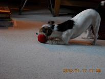Billieは根気が続くワンちゃんのようで、私などは何となく気の毒になってしまうくらい根気強くその食べ物を取り出そうと、おもちゃにこだわっていられるようだ。その穴にいれるTreatの形と大きさも取り出す難易度に影響してくるので、そこはどんなものを入れるかという点で、人間の判断がポイントになってくるのではないかと思う。根気の無いワンちゃんに余りにも取り出しにくい形状のものを入れても、効果がないということになるので、飼い主が自分のワンちゃんの頭脳と性質を把握しておく必要があるというわけだ。Billieは相当粘っている。もう20分以上だ。ちょっとそのおもちゃを置いて足で頭を掻いている時に、ちょっと足りだし易くしてあげようかと思って私が取ろうとしたら、頭を掻くのを即止めて、そのおもちゃを私に取られまいとして、くわえる。実は今回は前回よりも取り出しにくい形のTreatを入れたのだ。